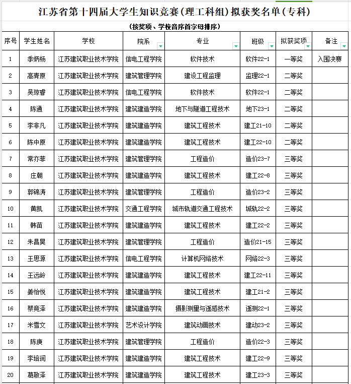 近日,江苏省第十四届大学生知识竞赛(理工科组)成绩揭晓,我校共有331名同学获奖,一等奖1人、二等奖5人、三等奖59人、优秀奖266人,其中信电工程学院软件22-1班季炳杨获专科组一等奖第一名(全省共16名)入围总决赛。