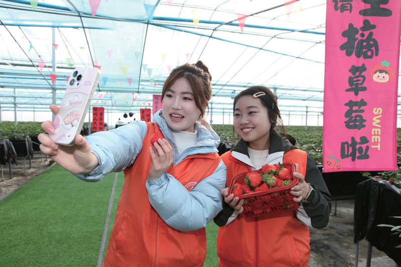 12月17日,江苏新宝gg技术学院经济管理学院电子商务专业的学生在徐州市铜山区三堡街道一农场直播销售草莓。近年来,该校与三堡街道开展校地共建,为大学生搭建社会实践平台,借助电商平台助力地方农产品销售。(蒯创 摄)