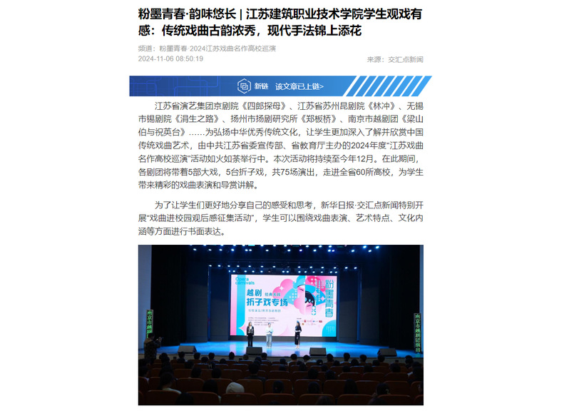 为了让学生们更好地分享自己的感受和思考,新华日报·交汇点新闻特别开展“戏曲进校园观后感征集活动”,学生可以围绕戏曲表演、艺术特点、文化内涵等方面进行书面表达。