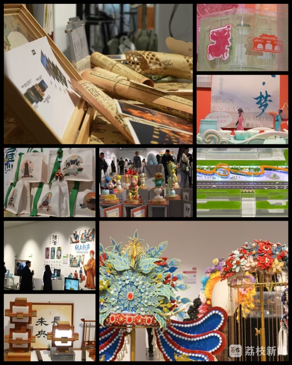 以AI辅助设计,用旋转走马灯,将汉画像石融入邳州年画;手机轻轻一碰,就可以解码昆曲背后的故事;还有精致的茶艺表演,精美的珠宝首饰,古色古香的非遗作品,生动有趣的动漫IP……同学们的创意作品亮点纷呈。