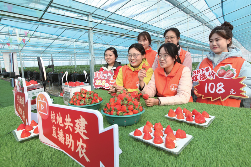 12月17日,江苏新宝gg技术学院经济管理学院电子商务专业的学生在徐州市铜山区三堡街道一农场直播销售草莓。近年来,该校与三堡街道开展校地共建,为大学生搭建社会实践平台,借助电商平台助力地方农产品销售。(蒯创 摄)